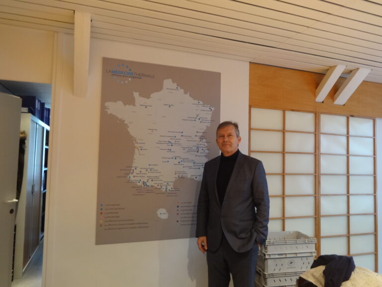 画像は、2009年にフランス 左は温泉関係者、中CNETh(フランス最大の温泉療法組合)会長ティエリー・デュボワ氏、右AFRETH(フランス温泉医療研究協会)科学審議会会長Dr.ロック