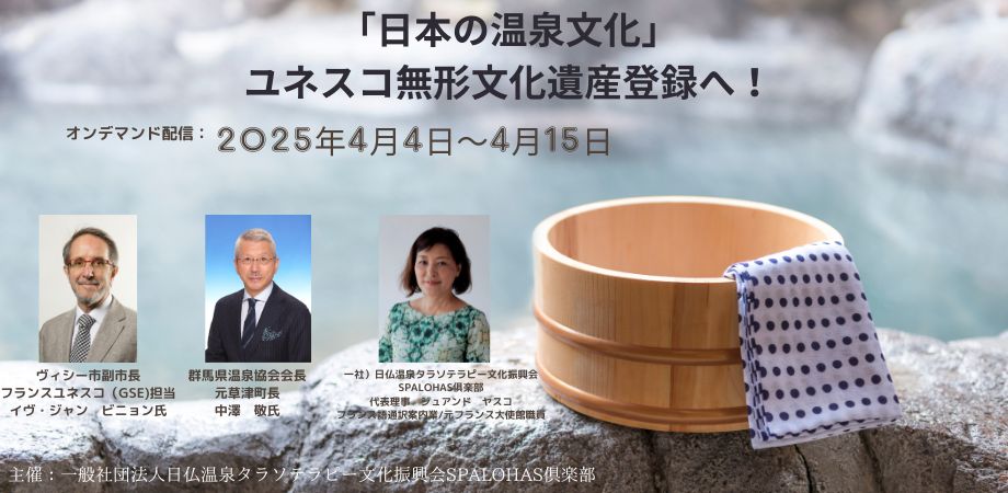 詳細ページ公開のお知らせ           第3回日仏ウェルネスウェビナー「日本の温泉文化」ユネスコ無形文化遺産登録へ!