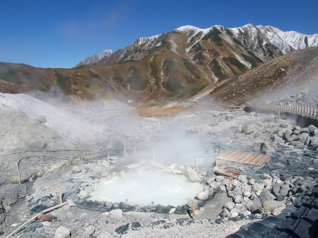 立山地獄はいま地獄谷と呼ばれ、標高2300mと日本で最も高所に湧く温泉で知られる。泉源地帯は噴気や有毒ガスで危険なので、周辺に建つ山小屋・宿泊施設まで引湯している。かつて死者の霊魂が集まったという立山地獄の周辺に今は観光客が集い、硫黄泉に入浴しながら三千メートル級の冠雪の山並みを楽しんでいる。